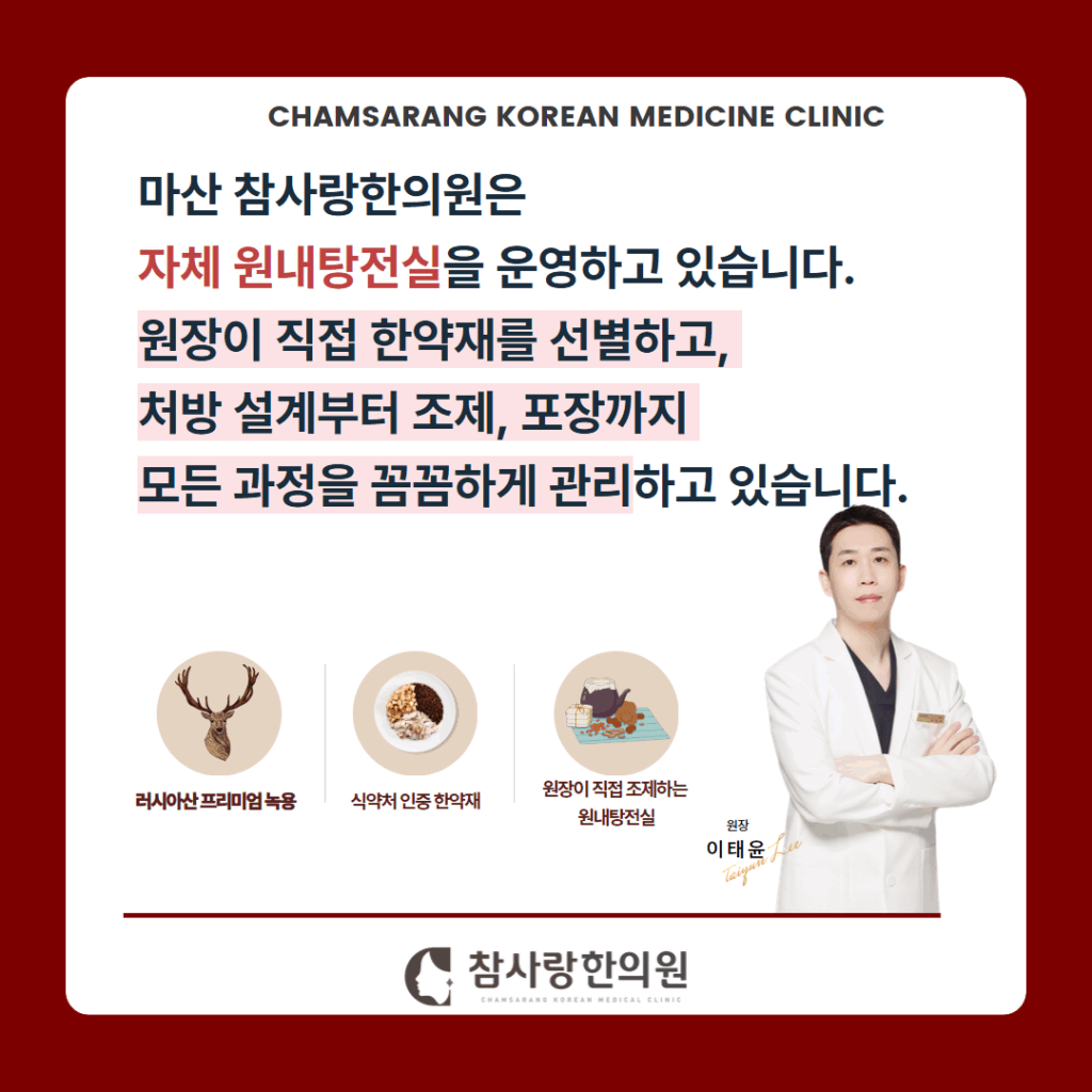 CHAMSARANG KOREAN MEDICINE CLINIC 참사랑 眞. 한약 관리 참사랑한의원의 眞. 보약 01 자체 원내 탕전실 직접 운영 참사랑 한약은 다릅니다 참사랑한의원은 자체 원내탕전실을 직접 운영하고 있습니다약재의 선정 및 관리부터 처방, 조제까지 병의원의 환자가 복용하는 모든 한약을 대표원장이 직접 관리합니다참사랑한의원은 청정한약을 고집할 수 밖에 없습니다몸에 좋은 약재인지, 깨끗한지, 믿을 수 있는지 환자분들은 고민하실 필요가 없습니다참사랑한의원이 더 엄격하고 꼼꼼하게 생각하고 만듭니다참사랑 한약은 잔류농약검사, 중금속 검사, 독성검사, 이산화황 검사, 이화학 검사를 모두 통과했습니다 내 가족을 위하는 마음으로.이것이 바로 참사랑 한약 관리의 핵심입니다 02 인증받은 가장 좋은 한약재만 고집합니다 자체원내탕전 시스템으로 정확하고 신속하게 처방이 가능합니다참사랑한의원의 한약은 좋은 재료만을 사용하여 안전하고 깨끗하게 조제되고 있습니다가장 좋은 약재를 온전히 전달해 드리기 위하여 약재 보관시 품질 및 성분에 변화가 발생하지 않도록 철저하게 약재의 품질을 관리하고 있습니다 03 참사랑 녹용한약 壽 녹용은 근력을 강화하는 유전자 발현을 증가시켜, 피로를 감소시켜 줍니다 조혈 인자 생성을 촉진하여 빈혈 개선 뛰어난 항산화 효과를 통해 세포 손상을 억제하여 노화 방지 뼈 성장 관련 인자를 활성화하여 성장 촉진 암세포 증식을 억제하고 세포 사멸을 유도하여 항암 효과 피부 세포 재생을 촉진하고 염증을 억제하여 피부 상처 회복 04 참사랑 한약 이래서 좋습니다 꼼꼼한 진맥으로 1대1 체질 맞춤 처방 GMP 인증받은 청정 프리미엄 한약재 20년차 한방 진료 경력 한의사의 섬세한 진료 일괄적인 처방이 아닌 15일 단위로 몸 상태에 맞춰 처방 내 가족을 위하는 마음으로 정성을 다합니다 자체 원내탕전실 직접 운영하는 참사랑한의원 보약 상담 예약하기